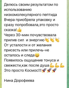 Нина Дорофеева чувствовала хроническую усталость. Каждый день, работая, она ощущала себя выжатой как лимон. Она решила попробовать пептид. Уже через 30 минут она почувствовала прилив сил и энергии. Нина описала это как «ощущение свежести, как после душа». Это было её открытием. Не лекарства, не кофеин — пептиды восстанавливают силы намного быстрее.