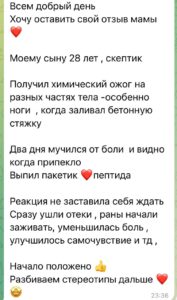 Сын Олены — скептик. Он получил сильный химический ожог на ногах, и было больно, он даже не верил, что что-то может помочь. В традиционной медицине для таких случаев часто применяют сложные процедуры и долгие курсы лечения. Но Олена решила попробовать пептид. Через несколько часов отёки ушли, боль снизилась, а раны начали заживать гораздо быстрее. Это реальный случай, который доказывает, что пептиды могут работать там, где кажется, что ничто не поможет.